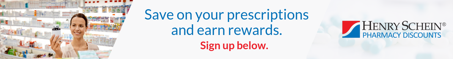 We have partnered with Henry Schein Pharmacy Discounts to offer our customers a prescription savings program with discounts of up to 90% off their medications. Even if you have excellent insurance cover, the discounted cash price may be cheaper than your copay.Furthermore, if you sign up for a free account with Henry Schein Pharmacy Discounts you can earn Reward Points every time you save on your prescriptions. Find out more here.